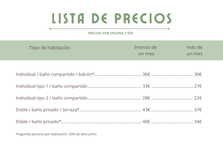 Los precios incluyen alojamiento, uso de espacios comunes, zona de trabajo y wifi. No hay cobros extra por usar lavadoras, toallas o sábanas. La comida no está incluida.